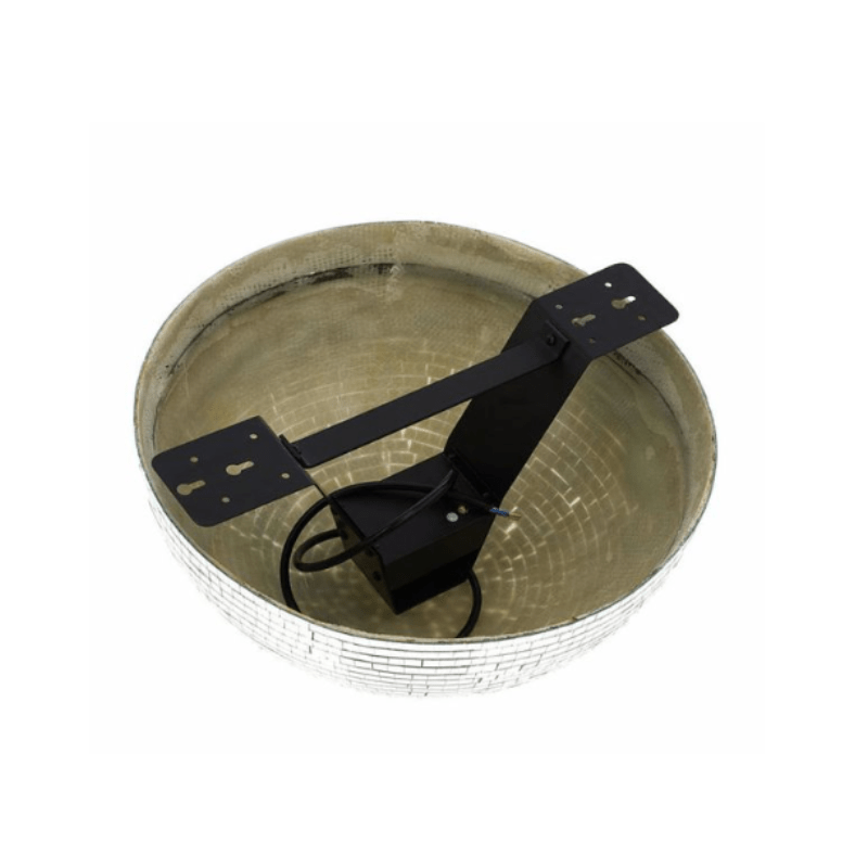 Demi-boule à facettes Ø30 cm montée sur moteur avec double crochet, idéale pour créer des effets lumineux dynamiques et scintillants.