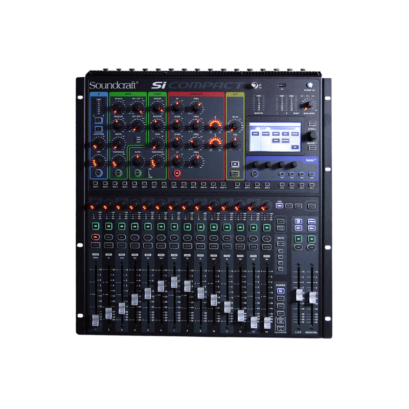 La Soundcraft Si Compact 16 est une console numérique live 16 préamplis micro (+ 4 stéréo) intégrant 4 moteurs Lexicon® stéréo, traitement complet sur chaque entrée et bus (compresseur, EQ paramétrique/graphique, délai), extension 64×64 via cartes (AES, MADI, etc.) et contrôle intuitif avec FaderGlow® et TOTEM, idéale pour concerts, théâtre.